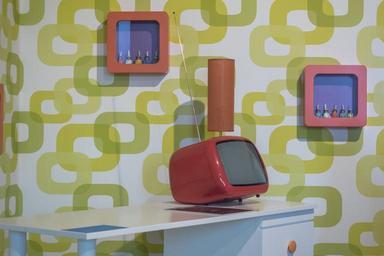 Keywords: living room cult 70s wallpaper retro form texture creativity color tv crt tube tv antenna