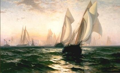 Keywords: Livonia v Genesta.jpg Livonia vs Genesta Americas Cup 1871 Oil on canvas 20 x 30 inches http //www vallejogallery com/item php title America's_Cup_1871_Livonia_vs_Genesta category id 1240 1885 Edward Moran PD PD-Art Edward Moran Genesta ship 1884 Boats under sail |