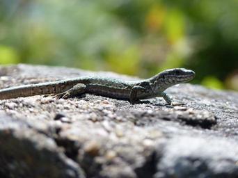 Keywords: lizard reptile green brown scale nature stone small rock animal wall cold blooded animals sun warm cheeky