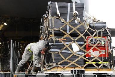 Keywords: loading cargo pallet transport industrial import commerce heavy shipment worker labor man male net strapping