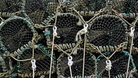 Keywords: lobster pot trap creel crayfish fishing seafood net mesh catch tackle crustacean fishery marine equipment fish harbor pier rope pile stack tied lashed lashing