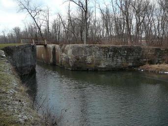 | Keywords: Lock 69 C and O Canal from NPS.jpg en Lock 69 NPS site says Lock 69 is the 11th of the 13 composite locks These locks differ from the other locks on the canal Between the upper end of the lower gate pockets to the lower end of the upper gate pockets the stone walls were moved 9 ¼° on each side resulting in a clear dimension between lock walls of 16 ™-16 ½ rather that the 15 ™ previously adhered to The normal clear dimension was resumed both up and down from these points The walls were of rough-cut and rough-coursed limestone principally dry-laid where the walls were widened and mortared in the other areas The wider area was filled in with 5 ¼ square timbers This wooden section of the lock was water-proofed at first by being kyanized and later with creosote Lock 69 is located a quarter of a mile below Lock 70 and two-thirds of a mile above Lock 68 The area is a fourth of a mile from the village of Oldtown and early Maryland settlement Start of work on the lock began in 1848 and it was finished in 1850 The wood lining of the lock was totally replaced with concrete after 1900 including the coping and much of the upper and lower extension and wingwalls Protruding existing bolts on the towpath side indicate an added heavy wood timber to the top of the wall probably as a tow line but no wood remains The lower concrete-covered lock gate pockets are 22 deep rather than the normal 16 one of the few instances in variance of this dimension The upper lock gates remain the towpath gate is in place and the berm is fallen in Much of the gate hardware is in place although not of the original type The wall are not nearly as plumb in the original 15' clear width is slight The lock has been dammed with concrete at the upper ened of the upper extension wall National Park Service http //www hscl cr nps gov/insidenps/report asp STATE PARK CHOH STRUCTURE SORT RECORDNO 1034 National Park Service Dept of Interior US Government Chesapeake Ohio Canal National Historical Park Locks water transport PD-USGov |