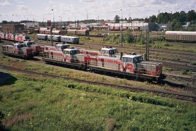 Keywords: Locomotives in Oulu Jul2008 001.jpg VR depot and freight yard in Oulu Finland The locomotives/railcars seen in the photo include Dr16 diesel locomotives closest to the photographer Sr2 electric locomotives left a Dm7 diesel multiple unit blue an Sr1 electric locomotive background left and a Dv12 diesel locomotive background right Dr16-dieselvetureita edessä Sr2-sähkövetureita vasemmalla sininen lättähattujuna Sr1-sähköveturi taustalla vasemmalla ja Dv12-dieselveturi taustalla oikealla own Methem Mikko J Putkonen 2008-07 Cc-zero 2008 in Oulu July 2008 in Finland Rail transport in Oulu Rail yards in Finland VR Class Dr16 |