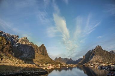 Keywords: lofted islands norway sky sea reflection clouds dawn port boats water