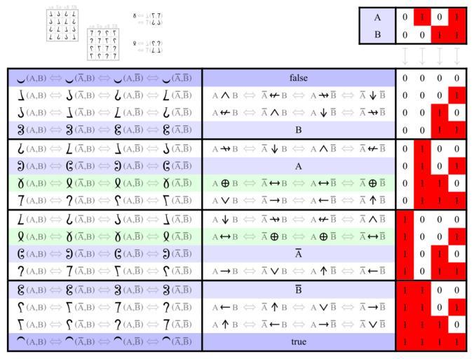 Keywords: Logical connectives table with shorthands.svg The sixteen binary logical connectives thumb left 500px condensed own Mate2code Propositional logic Nibble shorthands Colored nibbles blue green white Cc-zero