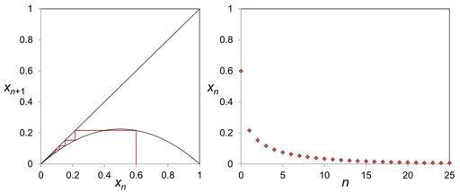 Logistic map cobweb and time evolution a=0.9.png (2014x842)
