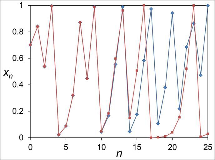 | Keywords: Logistic map example of butterfly effect.png ja パラメータ4のロジスティック写像 ステップ数0から25までの時間発展 鋭敏 (バタフライ効 )の例を図示 赤線: 0 7 線: 0 7+0 00001 en example of sensitive to initial conditions in the two time evolution of logistic map parameter a is 4 red line's initial vale x<sub>0</sub> is 0 7 blue line's is 0 7+0 00001 discrete time n is from 0 to 25 2014-12-31 own Yapparina other versions cc-zero Uploaded with UploadWizard Logistic map | ||||