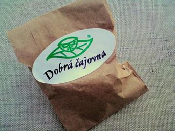 Keywords: Logo dobre cajovny.JPG en Sack with tea from Dobrá čajovna cs Papírový sáček s čajem zakoupený v Dobré čajovně Na nálepce je logo firmy Own Topika26 2009-05-13 Tea rooms in the Czech Republic