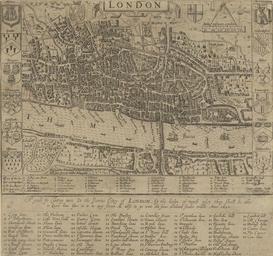 Keywords: London - John Norden's map of 1593.jpg A guide for Cuntrey men In the famous Cittey of London A map of London by John Norden 1593 This copy comes from the 1653 edition of Norden's Speculum Britainiæ Mirror of Britain re-issued after his death There is only one bridge across the Thames but parts of Southwark on the south bank of the river have been developed The coats of arms around the edge belong to the twelve largest city guilds These arms collectively were known as the Great Liveries Top right is the Merchant Tailors' arms Medium Engraving 229×241 mm Map scale 4 1 Statute Mile 1 15840 British library shalf mark Maps Crace I number 33 British Library http //www bl uk/onlinegallery/onlineex/crace/a/007000000000001u00033000 html 1593 re-issued in 1653 John Norden pd-old Old maps of the City of London 1593 in London 1593 maps John Norden |