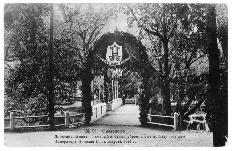 Keywords: Lopatinskiy garden 11.jpg en View of the bridge now rebuilt in Lopatinskii garden decorated for the visit to Smolensk Emperor Nicholas II ru Вид на мостик ныне пе ест оен в Лопатинском саду уб анный к п иезду в Смоленск импе ато а иколая Вто ого О игинальная отк ытка е установлены before 1917 года PD-RusEmpire 20th-century postcards Postcards of Smolensk