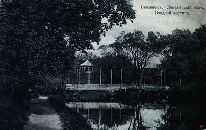 Keywords: Lopatinskiy garden 9.jpg en View of the pond and the bridge now rebuilt in Lopatinskii garden ru Вид на п уд и мостик ныне пе ест оен в Лопатинском саду О игинальная отк ытка е установлены before 1917 года PD-RusEmpire 20th-century postcards Postcards of Smolensk