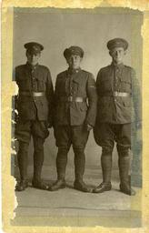 Keywords: people Description: Black and white photo postcard of three men wearing World War 1 uniforms. The man on the far right is identified as Lorne Wilson Armstrong, a member of the 161st Battalion. The other two men are not identified. Object ID : 2007.0062.239 Order a higher-quality version of this item by contacting the Huron County Museum (fee applies). Description: Black and white photo postcard of three men wearing World War 1 uniforms. The man on the far right is identified as Lorne Wilson Armstrong, a member of the 161st Battalion. The other two men are not identified. Object ID : 2007.0062.239 Order a higher-quality version of this item by contacting the Huron County Museum (fee applies).