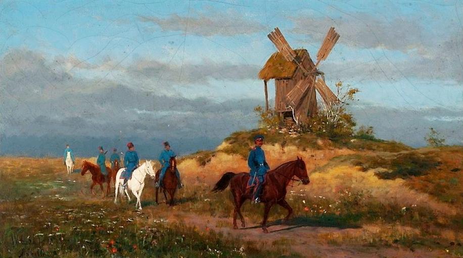 | Keywords: Łoś Cossacks before the windmill.jpg Artwork Creator Włodzimierz Łoś Patrol of Russian Cossacks during January Uprising ca 1880-1888 oil canvas cm 27 45 Institution National Museum Warsaw Not on view accession number MP 2131 object history ProvenanceEvent gift National Museum in Warsaw credit line W ŁOŚ / München signature/location bottom left http //cyfrowe mnw art pl/dmuseion/docmetadata id 8896 cyfrowe mnw art pl See below PD-old-auto 1888 DEFAULTSORT 1880-1888 circa; Cossacks before the windmill Volodymyr Los 19th-century Polish paintings in the National Museum in Warsaw Landscape paintings in the National Museum in Warsaw Russian Cossacks in art Paintings of windmills January Uprising in history paintings Paintings of Cossack men on horseback |