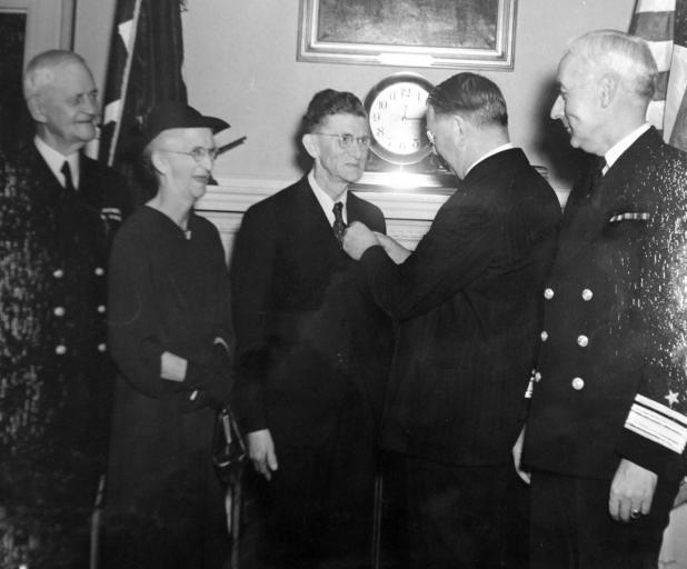 | Keywords: blackandwhite monochrome indoor black and white Lot-4263-25: The Honorable Frank Knox, Secretary of the Navy, presents the first official insignia to be awarded as part of the current shipbuilding program to Mr. Blair Blanton , of Newport News, Virginia. Mr. Blanton has been a shipworker for forty-three years and for the past forty-one years has been associated with the Newport News Shipbuilding and Dry Dock Company. He is a veteran of the Spanish-American War. The lapel insignia, a small pin depicting a ship with gold superstructure and white hull, will be presented to every shipworker throughout the country building vessels for the U.S. Navy and Maritime Commission. The workers of the prize-winning shipyards will be presented with the same type of insignia except that the ship’s hull be red, not white. Left to right: Rear Admiral Henry A. Wiley, Industrial Section, Office of Public Relations; Mrs. Blair Blanton; Mr. Blair Blanton; Secretary of the Navy, Frank Knox, Rear Admiral Bryson Bruce, Bureau of Ships. Secretary of the Navy Frank Knox Collection. Photographed through Mylar sleeve. (2015/11/20). Lot-4263-25: The Honorable Frank Knox, Secretary of the Navy, presents the first official insignia to be awarded as part of the current shipbuilding program to Mr. Blair Blanton , of Newport News, Virginia. Mr. Blanton has been a shipworker for forty-three years and for the past forty-one years has been associated with the Newport News Shipbuilding and Dry Dock Company. He is a veteran of the Spanish-American War. The lapel insignia, a small pin depicting a ship with gold superstructure and white hull, will be presented to every shipworker throughout the country building vessels for the U.S. Navy and Maritime Commission. The workers of the prize-winning shipyards will be presented with the same type of insignia except that the ship’s hull be red, not white. Left to right: Rear Admiral Henry A. Wiley, Industrial Section, Office of Public Relations; Mrs. Blair Blanton; Mr. Blair Blanton; Secretary of the Navy, Frank Knox, Rear Admiral Bryson Bruce, Bureau of Ships. Secretary of the Navy Frank Knox Collection. Photographed through Mylar sleeve. (2015/11/20). |