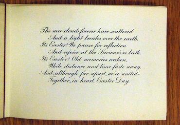 | Keywords: document text writing photo border Lot-7607-4a: WWI Greeting Cards. Card reads, “The war clouds forever have scattered / And a light breaks over the earth. / It’s Easter! We pause for reflection / And rejoice at the Saviour’s re-birth. It’s Easter! Old memories waken / While distance and time fade away / And although far apart, we’re united / Together, in heart, Easter Day.” Courtesy of the Library of Congress. (2016/09/02). Lot-7607-4a: WWI Greeting Cards. Card reads, “The war clouds forever have scattered / And a light breaks over the earth. / It’s Easter! We pause for reflection / And rejoice at the Saviour’s re-birth. It’s Easter! Old memories waken / While distance and time fade away / And although far apart, we’re united / Together, in heart, Easter Day.” Courtesy of the Library of Congress. (2016/09/02). |