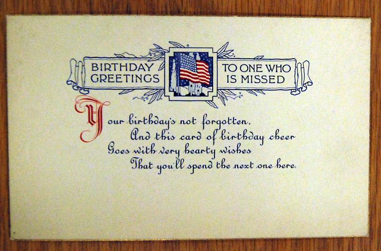 MAKE A MEME View Large Image Courtesy of the Library of Congress. (2016/09/02). Lot-7607-7: WWI Greeting Cards. Card reads, “”Birthday Greetings To One Who Is Missed. Your birthday’s not forgotten / And this card of birthday cheer / Goes with very hearty wishes / ...
