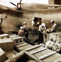 Keywords: Lot-926-5: The Navy’s Own Airline. Any mention of aircraft in war time invariably connotes the deadly use of planes as offensive and defensive weapons – bombers, fighters, and the varying adaptations of these two general classes. Yet, even in war, the plane is filling the function which was its biggest role in peacetime – and will be even more important when peace comes again. That is, the task of delivering passenger and freight. Flying under the aegis of the Naval Air Transportation Service (NATS), giant R4D planes (the equivalent of DC-5’s) transport men and material of war all over the world to the fronts where they are needed the most. Founded five days after the Pearl Harbor attack, NATS today links five continents, spans many seas in its unending traffic runs. Its ever-growing staff of pilots and groundsmen now includes 2,500 men. Run in business-like fashion, according to minutely-timed schedules, NATS operates 60,000 miles of flight, stopping at every type of field from jungle “whistle-stops” to metropolitan airports. Shown: Panama Delivery. A heavy cargo of supplies for the U.S. Naval Base at Coco Solo, Panama Canal Zone, is unloaded from the roomy hull of a NATS plane after a speedy flight from the United States. Official Navy Photograph, released October 5, 1943. Courtesy of the Library of Congress. (2016/04/14). Note, photographed through Mylar sleeve. Lot-926-5: The Navy’s Own Airline. Any mention of aircraft in war time invariably connotes the deadly use of planes as offensive and defensive weapons – bombers, fighters, and the varying adaptations of these two general classes. Yet, even in war, the plane is filling the function which was its biggest role in peacetime – and will be even more important when peace comes again. That is, the task of delivering passenger and freight. Flying under the aegis of the Naval Air Transportation Service (NATS), giant R4D planes (the equivalent of DC-5’s) transport men and material of war all over the world to the fronts where they are needed the most. Founded five days after the Pearl Harbor attack, NATS today links five continents, spans many seas in its unending traffic runs. Its ever-growing staff of pilots and groundsmen now includes 2,500 men. Run in business-like fashion, according to minutely-timed schedules, NATS operates 60,000 miles of flight, stopping at every type of field from jungle “whistle-stops” to metropolitan airports. Shown: Panama Delivery. A heavy cargo of supplies for the U.S. Naval Base at Coco Solo, Panama Canal Zone, is unloaded from the roomy hull of a NATS plane after a speedy flight from the United States. Official Navy Photograph, released October 5, 1943. Courtesy of the Library of Congress. (2016/04/14). Note, photographed through Mylar sleeve.