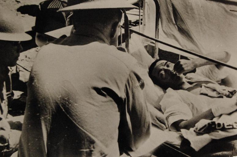 | Keywords: monochrome Lot-9432-9: Battle of Bataan, 7 January – 9 April 1942. How Tireless U.S.-Filipino Medical Workers Cared for the Wounded of Bataan. The heroism of Bataan was not confined to the front lines. Behind, but not far from the scenes of battle, a little band of men and women – some of them members of the U.S. Medical Corps, some of them Red Cross workers – ministered to the wounded and carried on a continuing fight against fatigue, disease and death. Shown: A U.S. Army officer talks to a wounded Japanese prisoner undergoing treatment at one of the Filipino-U.S. forces’ makeshift hospitals on Bataan Peninsula. The Japanese was amazed at the care he was given. He had been convinced that he would be killed. Office of War Information Photograph, 9-15 April 1942. Original photograph is small. (2015/12/18). Lot-9432-9: Battle of Bataan, 7 January – 9 April 1942. How Tireless U.S.-Filipino Medical Workers Cared for the Wounded of Bataan. The heroism of Bataan was not confined to the front lines. Behind, but not far from the scenes of battle, a little band of men and women – some of them members of the U.S. Medical Corps, some of them Red Cross workers – ministered to the wounded and carried on a continuing fight against fatigue, disease and death. Shown: A U.S. Army officer talks to a wounded Japanese prisoner undergoing treatment at one of the Filipino-U.S. forces’ makeshift hospitals on Bataan Peninsula. The Japanese was amazed at the care he was given. He had been convinced that he would be killed. Office of War Information Photograph, 9-15 April 1942. Original photograph is small. (2015/12/18). |