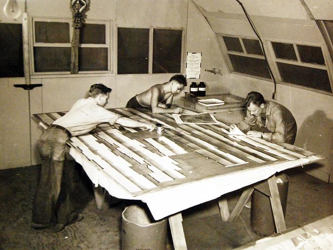 Keywords: Lot 9780-3: The Navy’s Flying Photographers, January 25, 1944. In the long Pacific front, few branches of the Allied forces charged with prying the Japanese out of their scattered island bases are more vital than aerial photo reconnaissance squadrons. Swooping down over the enemy outposts, defying the anti-aircraft fire which guards salient sections, “camera” planes film details of construction and topography invaluable to intelligence officers. From their photographs, scenic maps are made, and photo interpretation reports prepared which supply vital information for combat tactics. Such a squadron is the Navy’s famed, VD-1, based on Guadalcanal. In their own photographs, they tell part of the story of the all important roles they are playing in building the road to Tokyo. Shown: Panorama of Bougainville Shoreline. Members of the photo interpretation section of VD-1 assemble a series of pictures into a panorama of the shoreline around Empress Augusta Bay on Bougainville. When U.S. Marines land on those shores soon after, the pictures and maps therefrom greatly facilitated the invasion. U.S. Navy Photograph. Courtesy of the Library of Congress. (2016/04/22). Lot 9780-3: The Navy’s Flying Photographers, January 25, 1944. In the long Pacific front, few branches of the Allied forces charged with prying the Japanese out of their scattered island bases are more vital than aerial photo reconnaissance squadrons. Swooping down over the enemy outposts, defying the anti-aircraft fire which guards salient sections, “camera” planes film details of construction and topography invaluable to intelligence officers. From their photographs, scenic maps are made, and photo interpretation reports prepared which supply vital information for combat tactics. Such a squadron is the Navy’s famed, VD-1, based on Guadalcanal. In their own photographs, they tell part of the story of the all important roles they are playing in building the road to Tokyo. Shown: Panorama of Bougainville Shoreline. Members of the photo interpretation section of VD-1 assemble a series of pictures into a panorama of the shoreline around Empress Augusta Bay on Bougainville. When U.S. Marines land on those shores soon after, the pictures and maps therefrom greatly facilitated the invasion. U.S. Navy Photograph. Courtesy of the Library of Congress. (2016/04/22). |