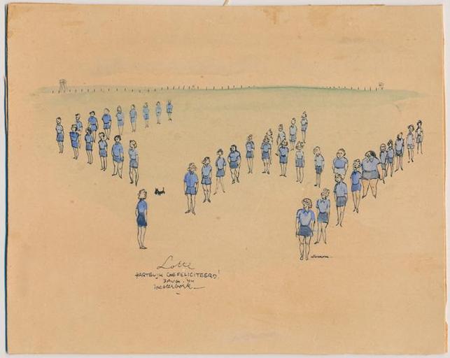 | Keywords: Lotte Heider-Lehmann door Leo Kok.jpg nl Lotte 1908 kwam op 3 september 1942 in kamp Westerbork terecht Ze kreeg een baantje als gymnastiekleidster De lessen werden op het speelterrein van het weeshuis barak 35 gegeven De soms komisch aandoende oefeningen werden gefilmd door de kampfotograaf Breslauer en getekend door Leo Kok Leo Kok maakte de tekening naar aanleiding van Lotte ™s verjaardag op 3 augustus 1944 De dames staan opgesteld volgens de initialen van hun lerares Ze volgen haar aanwijzingen Interessant zijn de talloze details waarvan de betekenis en identiteit soms onbekend zijn Bijvoorbeeld de dikke vrouw het hondje en de man marechaussee fietsend langs het prikkeldraad 1944-08-03 http //www actienietweggooien nl/in-de-vitrine/lotte-heider-lehmann-door-leo-kok Leo Kok other versions Custom license marker 2016 01 24 1945 Drawings by Leo Kok |