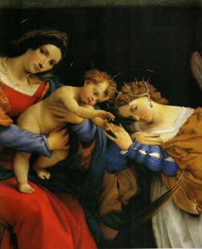 Keywords: Lotto, nozze mistiche bergamo 01.jpg detail mystical marriage Oil on canvas scan from Carlo Pirovano Lotto Electa Milano 2002 1523 - Accademia Carrara Bergamo creator Lorenzo Lotto Mystic marriage of Saint Catherine of Alexandria Lotto Bergamo PD-old-100 |