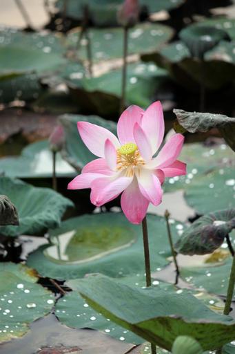 Keywords: lotus flowers pink blossoms blooms blooming petals floating green leaves round aquatic water plants floral flowering decorative ornamental bright sunny day dew droplets wet sacred serene