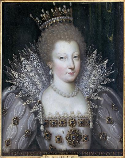 | Keywords: Louise Marguerite de Lorraine Conty Anonyme Chantilly.jpg 1600 1610 Oil on panel Size cm 47 57 Institution Musée Condé 00000077271 object history Roger de Gaignières; Jean-Baptiste Colbert de Torcy; Alexandre Lenoir; George IIIè duc de Sutherland; duc d'Aumale credit line achat 1876 LOUISE MARGUERITE DE LORRAINE PRIN DE CONTY accession number PE 290 own Jebulon 2011-07-03 other versions <gallery>Circa 1610 portrait of Louise Marguerite of Lorraine as Princess of Conti wearing a crown Musée Condé jpg Château de Chantilly-Louise Marguerite de Lorraine-20120917 jpg</gallery> 49 11 39 3 N 2 29 7 8 E PD-old-100 17th-century unidentified painters from France 1600s French paintings in the Musée Condé 17th-century portrait paintings in the Musée Condé 1600s Louise Marguerite of Lorraine 1600s 17th-century oil portraits of women at bust length 1600s Crowns of princes and princesses of the blood in art Females with clothing with pearls in art 1600s Females with pearl earrings in art 1600s Females with pearl necklaces in art 1600s Lace collars in art 1600s Portrait paintings of women wearing crowns 1600s Princely crown Quality images by Jebulon Quality images of Oise Uploaded with UploadWizard QualityImage Quality images of paintings |