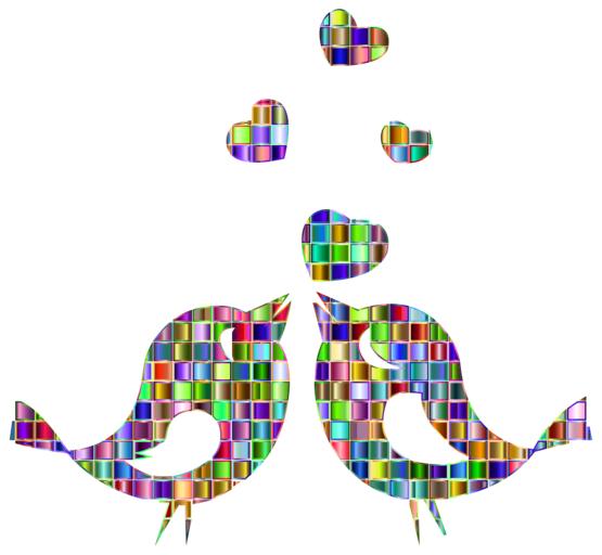 Keywords: love birds animals flying hearts romance couple valentine colorful prismatic chromatic rainbow abstract geometric art mosaic squares
