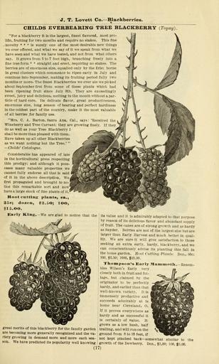 | Keywords: Lovett's illustrated catalogue of fruit and ornamental trees and plants for the autumn of 1891 (16379926714).jpg y <br> first propagated and brought tono-j <br> tice this remarkable sort and now <br> have a large stock of fine plants of it <br> Root cutting plants ea <br> 2oc; dozen 2 50; lOO <br> 15 00 <br> Early King -We are glad to notice that the its value and it is admirably adapted to that purpose <br> by reason of its delicious flavor and abundant supply <br> of fruit The canes are of strong growth and as hardy <br> as Snyder Berries are not of the largest size but are <br> larger than Early Harvest and much better in qual- <br> ity We are sure it will give satisfaction to those <br> seeking an extra early hardy blackberry and we <br> can conscientiously advise its planting this fall in <br> the home garden Root Vuttitw PJa7iti Doz 60c <br> 100 S3 50; 1000 25 00 <br> I Thompson's Early ammotli <br> bles Wilson's Early very <br> closely both in fruit and fol- <br> I iage but claimed by the <br> originator to be perfectly <br> hardy and earlier than that <br> well-known variety It is <br> immensely productive and <br> succeeds admirably at ts <br> home near Cleveland 0 <br> If it proves everywhere as <br> hardy and as successful it <br> is certainly of value It <br> grows as a low bush half <br> trailing and will run on the <br> ground from 8 to 16 feet if <br> not kept pinched back ” somewhat similar to the <br> growth of the Dewberry Doz 1 00; 100 5 00 <br> -Resem- <br> great merits of this blackberry for the family garden <br> are becoming more generally recognized and the va- <br> riety growing in demand more and more each sea- <br> son We have predicted its popularity well knowing <br> 17 42764469 136632 68527 Page 17 Text http //www biodiversitylibrary org/page/42764469 1891 10 5962/bhl title 68527 Henry G Gilbert Nursery and Seed Trade Catalog Collection ; J T Lovett Company ; J T Lovett Company Biodiversity Heritage Library Lovett's illustrated catalogue of fruit and ornamental trees and plants for the autumn of 1891 Catalogs Commercial catalogs Fruit J T Lovett Company Little Silver New Jersey Plants Ornamental Seeds Shrubs Trees U S Department of Agriculture National Agricultural Library bhl page 42764469 dc identifier http //biodiversitylibrary org/page/42764469 bhlGardenStories Blackberry j t lovett company little silver new jersey plants ornamental u s department of agriculture national agricultural library bhlgardenstories Information field Flickr posted date ISOdate 2015-04-01 CC-BY-2 0 BioDivLibrary https //flickr com/photos/61021753 N02/16379926714 2015-08-23 22 05 34 cc-by-2 0 PD-old-70-1923 Lovett's illustrated catalogue of fruit and ornamental trees and plants for the autumn of 1891 Photos uploaded from Flickr by Fæ using a script Blackberries |