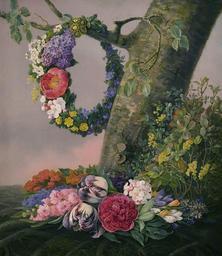 Keywords: Løvmand En buket blomster ved foden af et træ 1832.jpg en En buket blomster ved foden af et træ På en gren hænger en blomsterkrans painting by Danish artist Christine Løvmand oil on canvas 65 5 by 57 5 Statens Museum for Kunst http //soeg smk dk/vark asp ObjectId 8704 Christine Løvmand 1832 PD-old-100 Christine Løvmand 1832 paintings Paintings of flowers Paintings in Statens Museum for Kunst |