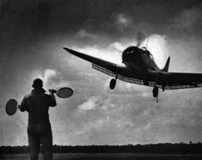 Keywords: LSO giving Cut Signal to SBD.jpg A U S Navy Landing Signal Officer guiding a Douglas SBD on a shore base during the Second World War U S Navy Naval Aviation News 1 January 1945 http //www history navy mil/nan/backissues/1940s/1945/1Jan45 pdf ca 1942-1944 USN PD-USGov-Military-Navy Landing Signal Officer Douglas SBD Dauntless |