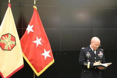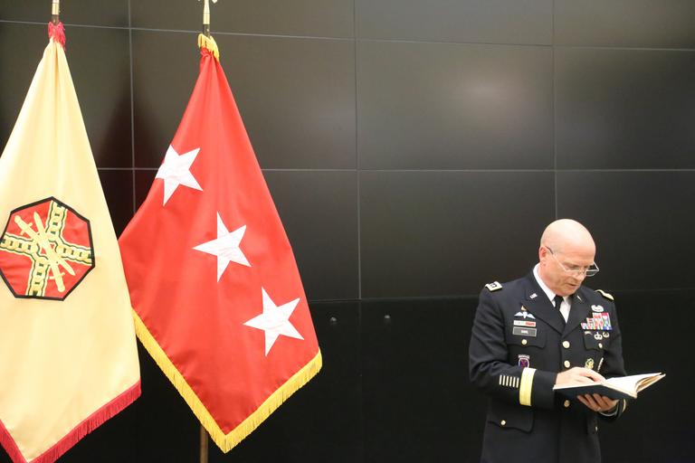 | Keywords: Lt. Gen. Kenneth R. Dahl, commanding general for U.S. Army Installation Management Command, greets Maj. Mark A. Fisher and his family at IMCOM headquarters Sept. 30, 2016, in advance of his promotion ceremony to lieutenant colonel. Family, coworkers and friends gathered at the operations center to hear the call to orders and join together in a receiving line and reception afterward. Dahl read an excerpt from a vintage copy of "The Armed Forces Officer" to inspire Fisher and the audience. (U.S. Army photo by Robert Dozier) |