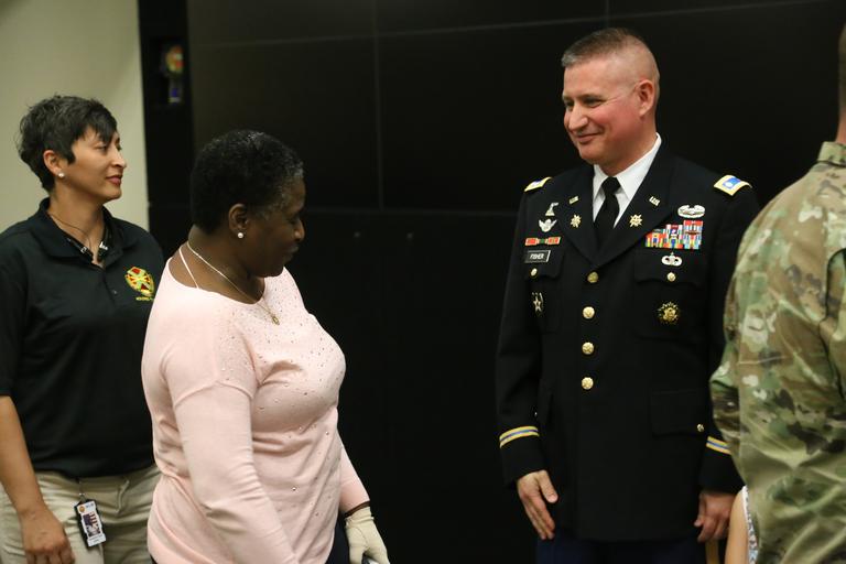| Keywords: Lt. Gen. Kenneth R. Dahl, commanding general for U.S. Army Installation Management Command, greets Maj. Mark A. Fisher and his family at IMCOM headquarters Sept. 30, 2016, in advance of his promotion ceremony to lieutenant colonel. Family, coworkers and friends gathered at the operations center to hear the call to orders and join together in a receiving line and reception afterward. Dahl read an excerpt from a vintage copy of "The Armed Forces Officer" to inspire Fisher and the audience. (U.S. Army photo by Robert Dozier) |