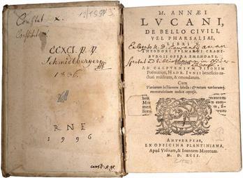 Keywords: Lucanus, De bello civili ed. Pulmann (Plantin 1592), title page.jpg Lucan ™s De bello civili alias Pharsalia edited by Theodor Pulmann also Pulman or Poelmann printed by the Officina Plantiniana Plantin and Johannes/Jan Moretus in Antwerp in 1592 On the title page you see the Plantin printer ™s emblema On the title page and on the endpaper at the left side different old and new owner notes ” Lucan ™s poem was always especially popular in times of civil wars or other kinds of general conflicts This little edition is a good example because it was prepared and published during the French Wars of Religion 1562 “98 as Theodor Pulmann mentions in his preface He explains the special actuality of Lucan by this fact Lucans Epos De bello civili auch Pharsalia herausgegeben von Theodor Pulmann auch Pulman oder Poelmann gedruckt von der Officina Plantiniana Plantin und Johannes/Jan Moretus in Antwerpen 1592 Auf der Titelseite ist die Plantin-Druckermarke zu sehen Auf der Titelseite und auf dem Vorsatz links verschiedene alte Besitzeinträge ” Lucans Epos war immer in Zeiten des BĂĽrgerkrieges oder anderer genereller Konflikte besonders populär Diese kleine Ausgabe ist ein gutes Beispiel dafĂĽr weil sie während der französischen Hugenottenkriege 1562 “1598 erschien wie Theodor Pulmann in seinem Vorwort erwähnt Er begrĂĽndet damit die besondere Aktualität gerade dieses Dichters own Book printed by the Officina Plantiniana Plantin/Moretus Antwerp Scan by Aristeas 1592 book printed ; 2010-01-03 scanned <gallery> File Plantin emblema from title page of Lucanus De bello civili ed Pulmann 1592 jpg Detail the printer ™s emblema File Lucanus _De_bello_civili_ed _Pulmann_ Plantin_1592 _p _002-003 jpg Page 2-3 Pulmann ™s foreword beginning File Lucanus _De_bello_civili_ed _Pulmann_ Plantin_1592 _p _004-005 jpg Page 4-5 Pulmann ™s foreword end </gallery> PD-old 1592 books Title pages from Belgium Pharsalia Jan Moretus Title pages in Latin |