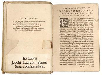 Keywords: Lucanus, De bello civili ed. Pulmann (Plantin 1592), p. 002-003.jpg Lucan ™s De bello civili alias Pharsalia edited by Theodor Pulmann also Pulman or Poelmann printed by the Officina Plantiniana Plantin and Johannes/Jan Moretus in Antwerp in 1592 <br/> On the left page 2 you see a Neolatin poem Hexastichon about Lucan ™s work and the ex-libris of a former owner On the right page 3 begins Pulmann ™s foreword a dedication letter to Nicolaus Rococcius This foreword is dated at the end to 1564 the year of Pulmann ™s 1st edition of Lucan ™s poem and treats the cruels of civil wars from ancient Rome to Pulmann ™s own time Lucans Epos De bello civili auch Pharsalia herausgegeben von Theodor Pulmann auch Pulman oder Poelmann gedruckt von der Officina Plantiniana Plantin und Johannes/Jan Moretus in Antwerpen 1592 <br/> Links ein neulateinisches Gedicht Hexastichon über Lucans Werk und das Exlibris eines Vorbesitzers Auf der rechten Seite 3 beginnt Pulmanns Vorwort ein Dedikationsbrief an Nicolaus Rococcius Dieses Vorwort ist am Ende auf 1564 datiert das Jahr von Pulmanns erster Lucan-Ausgabe und behandelt die Schrecken der Bürgerkriege vom alten Rom bis zu Pulmanns eigener Zeit own Foreword by Theodor Pulmann also Pulman or Poelmann Book printed by the Officina Plantiniana Plantin/Moretus Antwerp Scan by Aristeas 1592 book printed ; 2010-04-11 scanned <gallery> File Lucanus De bello civili ed Pulmann Plantin 1592 title page jpg Title page of the edition File Lucanus De bello civili ed Pulmann Plantin 1592 p 004-005 jpg The next two pages end of the foreword </gallery> PD-old 1592 books Text pages Pharsalia Jan Moretus Ex libris |