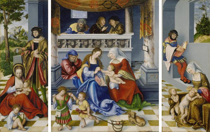 Keywords: Lucas Cranach d.Ä. - Torgauer Altar (Städelsches Kunstinstitut).jpg Artwork Creator Lucas Cranach I Kurfürst Friedrich dem Weisen und ihren zwei Söhnen; <br>Mitteltafel dargestellt sind Joseph Maria Anna und der Jesusknabe im Hintergrund auf der Brüstung die drei Gatten Annas Joachim Kleophas mit den Gesichtszügen Kaiser Maximilians I und Salomas möglicherweise mit den Zügen Sixtus Oelhafens Sekretär von Friedrich III Maximilian I und Karl V ; <br>rechter Flügel Maria Salome Halbschwester Mariens und der Bruder Friedrichs des Weisen Herzog Johann der Beständige; auf jeder Tafel wird eine Person die in einem Buch liest dargestellt; auf der linken Tafel Barnabas left panel St Mary Cleophas and Alphaeus with the features of Friedrich the Wise with their two sons; central panel depicts Joseph the Virgin Anna and the Christ Child as well as Anna's three husbands in the background Joachim Cleophas with the physiognomy and chain of Emperor Maximilian I and Salomas eventually with the physiognomy of Sixtus Oelhafens secretary of Friedrich III Maximilian I und Karl V ; right panel 1509 mixed media lime langSwitch central panel Mitteltafel cm 121 1 100 4 <br/> langSwitch the wings Seitenflügel je cm 40 120 institution Städel accession number 1398 http //www staedel de/sm/index php StoryID 1033 ObjectID 298 Städel Museum Frankfurt am Main<br/>http //www hr-online de/website/static/spezial/cranach/altar/cranah_launch_bild1_final swf hr-online<br/>http //www lucascranach org/object php obj DE_SMF_1398B_FR018 uid 2916 page 1 fol 01_Overall img DE_SMF_1398B_FR018_2011-07_Overall tifhttp //www lucascranach org/object php obj DE_SMF_1398A_FR018 uid 2915 page 1 fol 01_Overall img DE_SMF_1398A_FR018_2011-07_Overall tifhttp //www lucascranach org/object php obj DE_SMF_1398C_FR018 uid 2917 page 1 fol 01_Overall img DE_SMF_1398C_FR018_2011-07_Overall tif by Cranach Digital Archive object history credit line exhibition history la painted by Lucas Cranach 1509 Lucas Cranach schuf dies im Jahre 1509 Friedländer Rosenberg 1978 No FR018 http //nevsepic com ua/ nevsepic com ua PD-old-100-1923 1553 DEFAULTSORT Cranach Lucas 1; Heilige Sippe; Stadel ImageNote 1 1881 3195 1653 1588 7600 4792 2 die beiden Brüder und Märtyrer Simon Ze-lotes und Judas Thaddäus ImageNoteEnd 1 ImageNote 2 4636 4022 656 666 7600 4792 2 Der Hund als Symbol der Treue wird oft als Begleiter verheirateter Frauen dargetellt ImageNoteEnd 2 ImageNote 3 380 2291 732 1303 7600 4792 2 Maria Kleophas ImageNoteEnd 3 ImageNote 4 1093 998 466 532 7600 4792 2 Kurfürst Friedrich dem Weisen Alphaeus with the features of Friedrich the Wise ImageNoteEnd 4 Altars by Lucas Cranach the Elder German paintings in the Städel Renaissance paintings in the Städel 1500s paintings in the Städel 1509 paintings Torgauer Fürstenaltar |