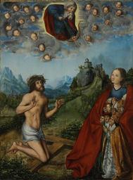 Keywords: Lucas Cranach d. Ä. - Pestbild (Budapest Museum of Fine Arts).jpg workshop of langSwitch Christ is depicted as the Man of Sorrows at the left of the image He kneels on an Ankh cross and looks up to God the Father who draws a bow with three arrows and aims at Mankind protected on the right side of the composition by the Virgin's mantle Christus kniet als Schmerzensmann links auf einem Tau-förmigen Kreuz und blickt zu Gottvater hinauf der einen Bogen mit drei Pfeilen spannt und damit auf die Menschheit zielt um die Maria auf der rechten Seite der Komposition schützend ihren Mantel legt circa 1516 “1518 oil lime size cm 74 5 56 Institution Budapest Museum of Fine Arts http //www szepmuveszeti hu/adatlap/christ_and_the_virgin_interceding_8649 langSwitch Museum of Fine Arts Budapest online collection Szépművészeti Múzeum <br/>http //lucascranach org/HU_SMB_128 Cranach Digital Archive object history credit line FR 1978 Nr FR134D accession number 128 https //www google com/culturalinstitute/beta/asset/christ-and-the-virgin-interceding-for-humanity-before-god-the-father/gQG5t2epvrriCQ Google Art Project PD-old-100-1923 DEFAULTSORT Cranach Lucas 1; Three Plagues; Museum of Fine Arts Budapest Jesus Christ by Lucas Cranach I German paintings in the Museum of Fine Arts Budapest Jesus Christ in art 16th-century paintings of Christian saints 1510s religious paintings 1510s paintings from Germany 1510s paintings in Hungary 16th-century religious paintings in Hungary Google Art Project works by Lucas Cranach the Elder Google Art Project works in Museum of Fine Arts Budapest |