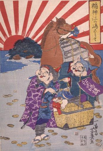 Keywords: Lucky Gods' visit to Enoshima.jpg ja 福神江の嶋もうて en Lucky Gods' visit to Enoshima 1869 明治2年 http //www mus city fujisawa kanagawa jp/php/history_item php id 20110 :落合芳幾/出版 : 屋宗次郎 PD-Japan Seven Lucky Gods Enoshima in art 1869 in art