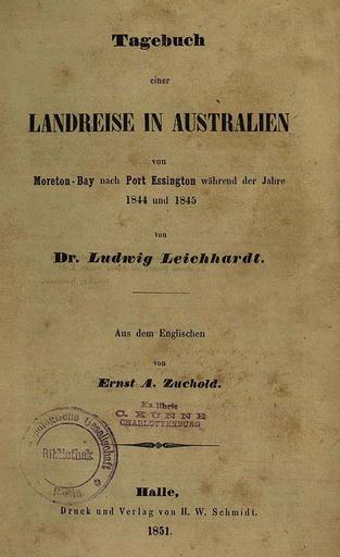 Keywords: Ludwig Leichhardt - Tagebuch einer Landreise in Australien.jpeg Tagebuch einer Landreise in Australien von Moreton-Bay nach Port Essington während der Jahre 1844 und 1845 Aus dem Englischen von Ernst A Zuchold Halle Druck und Verlag von H W Schmidt 1851 First German edition Stamp Ex libris C Künne Charlottenburg Stamp Anthropologische Gesellschaft Berlin Bibliothek http //www kettererkunst de/kunst/kd/details php obnr 410804420 anummer 348 1851 Ludwig Leichhardt 1813 “1848 PD-Old Ludwig Leichhardt's Overland Expedition in Australia Port Essington Northern Territory Images from Ketterer Kunst |