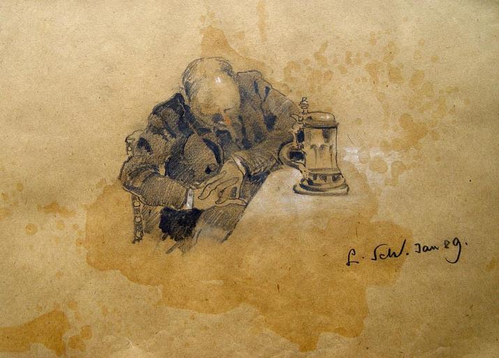 Keywords: Ludwig Scheuermann (1859 in Burghersdorp - 1911 in Herrsching) - Ludwig schlafend.jpg de Ludwig schlafend originale weißgehöhte Bleistiftzeichnung auf braunem Papier ca 25x34cm; unten rechts signiert und datiert L Sch Jan 18 89 von Ludwig Scheuermann 1859 in Burghersdorp/Südafrika - 1911 in Herrsching Blatt aus dem Album/Gästebuch aus den Jahren 1886 - 1898 der Münchner Mittwochsgesellschaft die der Verleger Hugo Bruckmann 1863 - 1941 im Zentral-Café Ungerer Dachauer Str 9 gegründet hatte Unter den Mitgliedern waren neben Scheuermann und Bruckmann der Verleger Edgar Hanfstaengl 1842-1910 die Maler August Leonhardi 1867 - 1931 Anton Mangold 1863 - 1907 und Moritz Röbbecke 1857 - 1916 Winfried von Miller 1854 - 1925 und Otto Seitz 1846 - 1912 1889-01 http //www zvab com/servlet/BookDetailsPL bi 16142642405 searchurl kn 3Daugust 2520otto 2520krug 26hl 3Don 26sortby 3D20 Ludwig Scheuermann 1859 in Burghersdorp/Südafrika - 1911 in Herrsching other versions PD-Art Ludwig Scheuermann |