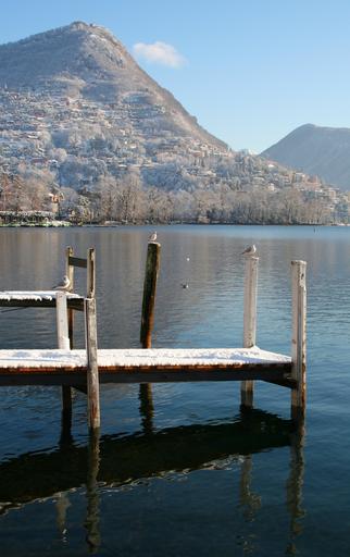Keywords: lugano switzerland water lake mountains winter snow sol mirrors quiet boat blue sky seagull bird bridge