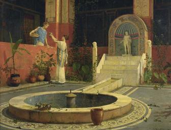 Keywords: Luigi Bazzani Picking flowers from the courtyard.jpg by 1927 Oil on panel cm 44 5 58 4 object history credit line Bazzani Roma signature/place lower right accession number http //www sothebys com/en/catalogues/ecatalogue html/2012/old-master-19th-century-european-art-n08826 Sotheby's N08826 PD-old-70 Images from Sotheby's Luigi Bazzani Flower picking in art Ancient Rome in art Atriums in art Paintings of courtyards and patios Pottery in painting Ceramic tiles floors in art |