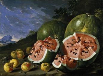Keywords: Luis Melendez, Still Life with Watermelons and Apples, Museo del Prado, Madird.jpg Artwork Creator Luis Egidio Meléndez century 18 Oil on canvas Institution Museo del Prado object history credit line accession number https //www museodelprado es/coleccion/galeria-on-line/galeria-on-line/obra/bodegon-con-sandias-y-manzanas-en-un-paisaje/ Galería online Museo del Prado PD-old-100 Luis Egidio Meléndez Spanish 18th-century paintings in the Museo del Prado Still life paintings in the Prado Museum 18th-century paintings not categorised by year 18th-century oil on canvas paintings in Spain 18th-century still life paintings Oil still life paintings Still-life paintings with apples Paintings of watermelons Still life paintings of melons |