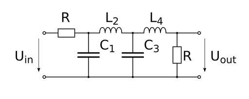 Keywords: Lumped elements ladder filter order 4.svg en 4th order analog lumped elements ladder filter own Fcorthay electric engineering filter signal processing Cc-zero Electrical engineering Filter circuits Analog circuits Lowpass filter circuits