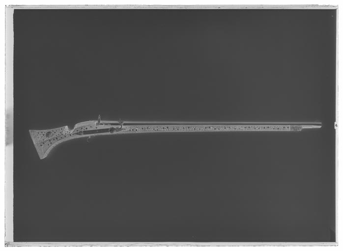 Keywords: Luntlåsmusköt, 1500-talets slut, Tyskland eller Nederländerna - Livrustkammaren - 19106-negative.tif LSH artwork sv Åttsidig slätborrad pipa stämplad 3 ggr under kammaren med oval bladliknande figur Vid pipan fäst fängpanna rektangulär med fasad underkant svängbart fängpannelock punsad dekor arm med svarvad knopp krutskärm med konturerad överkant och infälld i spår i pipan hög fästskruv med svarvad knopp Svansskruv med åttsidig platta av pipans bredd rektangulärt blad Rektangulärt hål vid svansskruvplattan fäste för sikte Riktmedel Stolpkorn med starkt svängd överkant Fästning Tre häften Pipan fäst med krysskruv underifrån samt två pipstift av ben och ett av stål Luntlås med hävstångsmekanism rektangulärt platt låsbleck l 295 mm i båda ändrarna bladformiga flikar med punsad dekor hål för låsskruvarna Hane med oregelbundet rund något välvd kropp genombruten av hål på ryggsidan svängd hals med mittås platt drakformigt konturerad luntklämma punsad dekor Klämskruv med c-formigt huvud På låsbleckets inisda ovanför hävstångsfjäderns fäste tre små triangulära stämplar Fästning Två låsskruvar C-formig bred och platt avtryckare Rektangulärt avtryckarbleck av ben med rundade hörn graverad dekor Helstock av valnöt med muskötkolv och sluten laddstocksränna Yttäckande inläggningar av ben och pärlemor rankor lister och rundlar På kolvens vänstra sida en oval pärlemorplatta med en graverad naken yngling droppformig pärlemorplatta med graverad maskaron ur vars mun rankverket utgår På kolvens h sida en pärlemorplatta med bröstbild av en man med lagerkrans om håret dräkt med fyrkantig urringning En droppformig platta saknas Utefter bakkanten band av benplattor med graverade harar den nedre plattan på båda sidor saknas Hälbeslag av mässing bakplåt av ben med graverad palmettliknande dekor större delen av bakplåten saknas kolvtån avslagen På kolvryggen en benplatta med graverad bladdekor halva plattan saknas Bakom svansskruvbladet graverad benplatta på båda sidor därom urtag för större plattor som nu saknas Framför den bakrel åsskruven en oval pärlemorplatta med gravera dekor naken man med ymnighetshorn en bit av plattan avskalad Rörka av ben med graverad lejonmaskaron Näsbandet saknas liksom varbygeln Ovanför låsblecket stämplat I 67 I urtaget för benplattan till vänster om svansskruvbladet skrivet med blyerts 56 I original caption end other date century 16 steel e12 - eldvapen - pipa och lås material stål - bone e8 - eldvapen - stockdekor material ben - brass e7 - eldvapen - stockbeslag material mässing - mother-of-pearl e8 - eldvapen - stockdekor material pärlemor - walnut e3 - eldvapen - stock material valnöt g 7190 size mm 1240 pipa size mm 1612 LRK K Krigskollegium Sverige Gustav II Adolf av Sverige triangel anv e1 - eldvapen - pipa; anonym låssmed place of origin NL förmodad DE förmodad original filename LN_B16972_019852 38555 inventory number LRK 3123 19106 CC0 Luntlåsmusköt 1500-talets slut Tyskland eller Nederländerna - Livrustkammaren - 19106 tif |