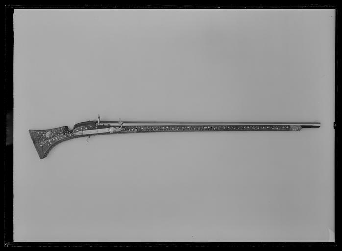Keywords: Luntlåsmusköt, 1500-talets slut, Tyskland eller Nederländerna - Livrustkammaren - 19106.tif LSH artwork sv Åttsidig slätborrad pipa stämplad 3 ggr under kammaren med oval bladliknande figur Vid pipan fäst fängpanna rektangulär med fasad underkant svängbart fängpannelock punsad dekor arm med svarvad knopp krutskärm med konturerad överkant och infälld i spår i pipan hög fästskruv med svarvad knopp Svansskruv med åttsidig platta av pipans bredd rektangulärt blad Rektangulärt hål vid svansskruvplattan fäste för sikte Riktmedel Stolpkorn med starkt svängd överkant Fästning Tre häften Pipan fäst med krysskruv underifrån samt två pipstift av ben och ett av stål Luntlås med hävstångsmekanism rektangulärt platt låsbleck l 295 mm i båda ändrarna bladformiga flikar med punsad dekor hål för låsskruvarna Hane med oregelbundet rund något välvd kropp genombruten av hål på ryggsidan svängd hals med mittås platt drakformigt konturerad luntklämma punsad dekor Klämskruv med c-formigt huvud På låsbleckets inisda ovanför hävstångsfjäderns fäste tre små triangulära stämplar Fästning Två låsskruvar C-formig bred och platt avtryckare Rektangulärt avtryckarbleck av ben med rundade hörn graverad dekor Helstock av valnöt med muskötkolv och sluten laddstocksränna Yttäckande inläggningar av ben och pärlemor rankor lister och rundlar På kolvens vänstra sida en oval pärlemorplatta med en graverad naken yngling droppformig pärlemorplatta med graverad maskaron ur vars mun rankverket utgår På kolvens h sida en pärlemorplatta med bröstbild av en man med lagerkrans om håret dräkt med fyrkantig urringning En droppformig platta saknas Utefter bakkanten band av benplattor med graverade harar den nedre plattan på båda sidor saknas Hälbeslag av mässing bakplåt av ben med graverad palmettliknande dekor större delen av bakplåten saknas kolvtån avslagen På kolvryggen en benplatta med graverad bladdekor halva plattan saknas Bakom svansskruvbladet graverad benplatta på båda sidor därom urtag för större plattor som nu saknas Framför den bakrel åsskruven en oval pärlemorplatta med gravera dekor naken man med ymnighetshorn en bit av plattan avskalad Rörka av ben med graverad lejonmaskaron Näsbandet saknas liksom varbygeln Ovanför låsblecket stämplat I 67 I urtaget för benplattan till vänster om svansskruvbladet skrivet med blyerts 56 I original caption end other date century 16 steel e12 - eldvapen - pipa och lås material stål - bone e8 - eldvapen - stockdekor material ben - brass e7 - eldvapen - stockbeslag material mässing - mother-of-pearl e8 - eldvapen - stockdekor material pärlemor - walnut e3 - eldvapen - stock material valnöt g 7190 size mm 1240 pipa size mm 1612 LRK K Krigskollegium Sverige Gustav II Adolf av Sverige triangel anv e1 - eldvapen - pipa; anonym låssmed place of origin NL förmodad DE förmodad original filename LN_B16972_019852 38555 inventory number LRK 3123 19106 CC0 Luntlåsmusköt 1500-talets slut Tyskland eller Nederländerna - Livrustkammaren - 19106-negative tif Muskets Media contributed by LSH dim-with multiple size templates Media contributed by LSH 2016-12 |