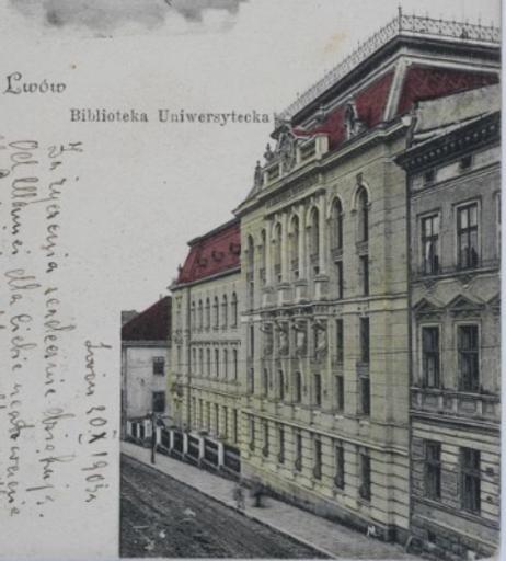 | Keywords: Lwów, biblioteka uniwersytecka 1905 w barwach.png uk Поштівка зі зоб аженням бібліотеки Львівського уніве ситету 1905 ік 1905 http //polona pl/item/704943/0/ author other versions Custom license marker 2015 09 25 PD-old Uploaded with UploadWizard 5 Drahomanova Street Lviv |