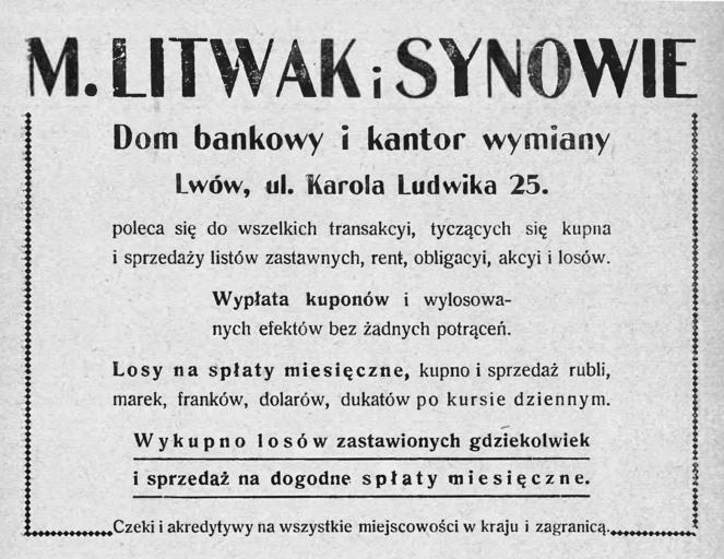 | Keywords: M. Litwak i synowie - advertisement (01).jpg uk Реклама банківського дому Літвак і сини у львівському путівнику 1913 ік http //www sbc org pl/dlibra/docmetadata id 42 Księga adresowa Król Stoł Miasta Lwowa Rocznik 17 1913 dodatek s 67 author 1913 Advertisements in Lviv 1913 advertisements Banks in Lviv PD-old |