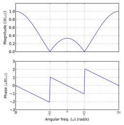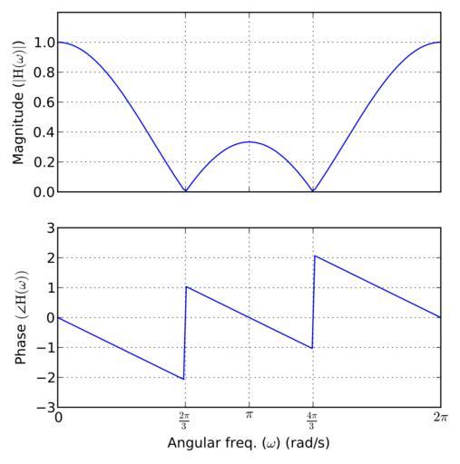 Keywords: MA2Amp C.svg en Frequency response of <math>H j\omega \frac 1 3 \left 1 + e -j\omega + e -j2\omega \right </math> The top plot is the magnitude plot and the bottom plot is the phase plot At the two frequencies where the magnitude goes to zero there is a sign reversal which causes the phase discontinuities by Ï radians Thus they are true discontinuities not artifacts of phase wrapping own Krishnavedala 2011-06-12 w File MA2Amp_C png and w File MA2Phase_C png and File Frequency_response_of_3-term_boxcar_filter gif validSVG Cc-zero Bode plots Impulse response Phase plots |