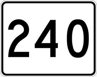 Keywords: MA Route 240.svg 750 mm by 600 mm 30 in by 24 in Massachusetts Route shield made to the specifications of the http //166 90 180 162/mhd/downloads/manuals/1996Mconst pdf 1996 edition of Construction and Traffic Standard Details sign M1-5 Uses the http //www triskele com/fonts/index html Roadgeek 2005 fonts United States law does not permit the copyrighting of typeface designs and the fonts are meant to be copies of a U S Government-produced work anyway The outside border has a width of 1 1 mm and a color of black so it shows up; in reality signs have no outside border The specs actually do not show the curve on the outside border instead making it a perfect rectangle but all signs I have seen round the corners Note The specs specify Series D font for the numbers However that font does not fit when none of the characters is a one and so those signs actually use Series C This image is true to real signs not the specs own SPUI spuiother Diagrams of Massachusetts Route shields 240 number |
